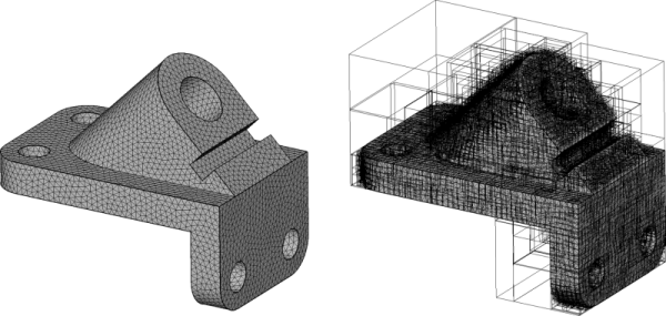 Figure 99.1 Left: surface triangle mesh of a mechanical part. Right: AABB tree constructed.