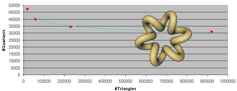 Figure 99.2 Number of queries per second against number of triangles for the knot model with 14K (shown), 57K, 230K and 921K triangles. We call the all_intersections()