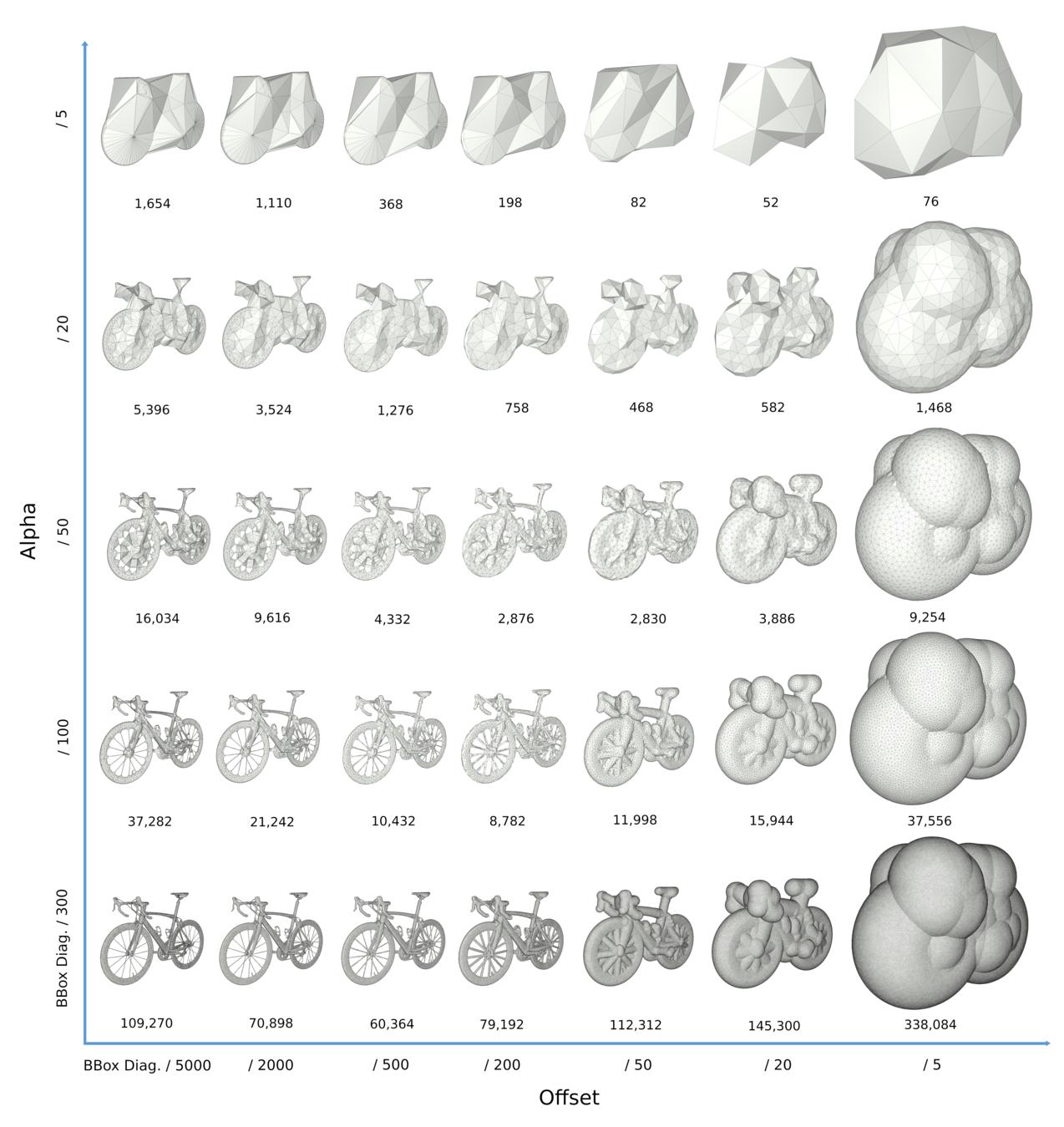 Here is an example with an input triangle mesh, with alpha set to 1/20 of the bounding box's longest diagonal edge length, and offset set to 1/30 of alpha (i.e., 1/600 of the bounding box diagonal edge length).