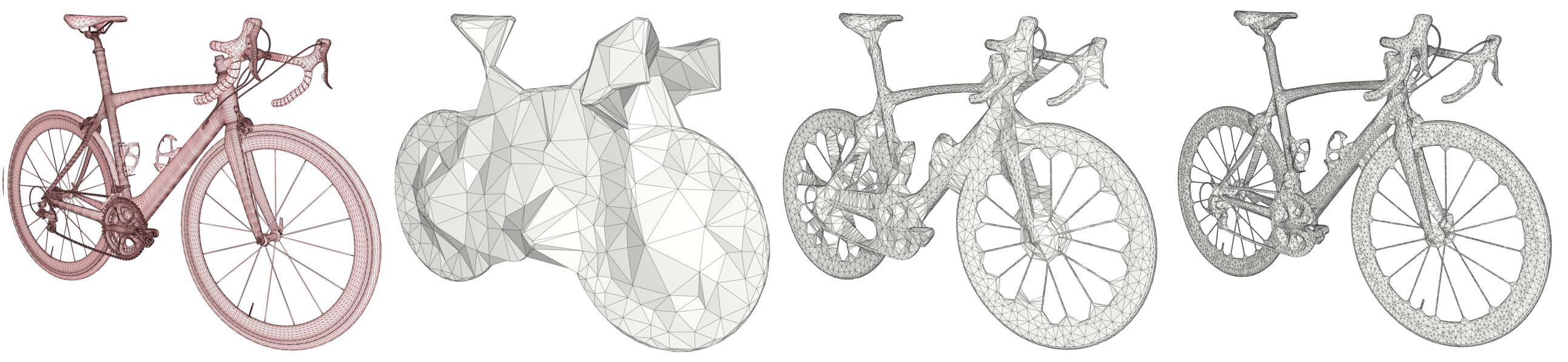 This process both prevents the creation of inner structures within the output and avoids superfluous computations. In addition, detaching our mesh construction from the geometry and discretization of the input has several advantages: (1) the underlying data is not restricted to a specific format (triangle soups, polygon soups, point clouds, etc.) as all that is required is answering three basic geometric queries: (a) the distance between a point and the input, (b) the projection of a query point onto the input, (c) an intersection test between a tetrahedron and the input, and (2) The user has more freedom to trade tightness to the input for final mesh complexity, as constructing a conservative approximation on a large offset of the input requires fewer mesh elements.