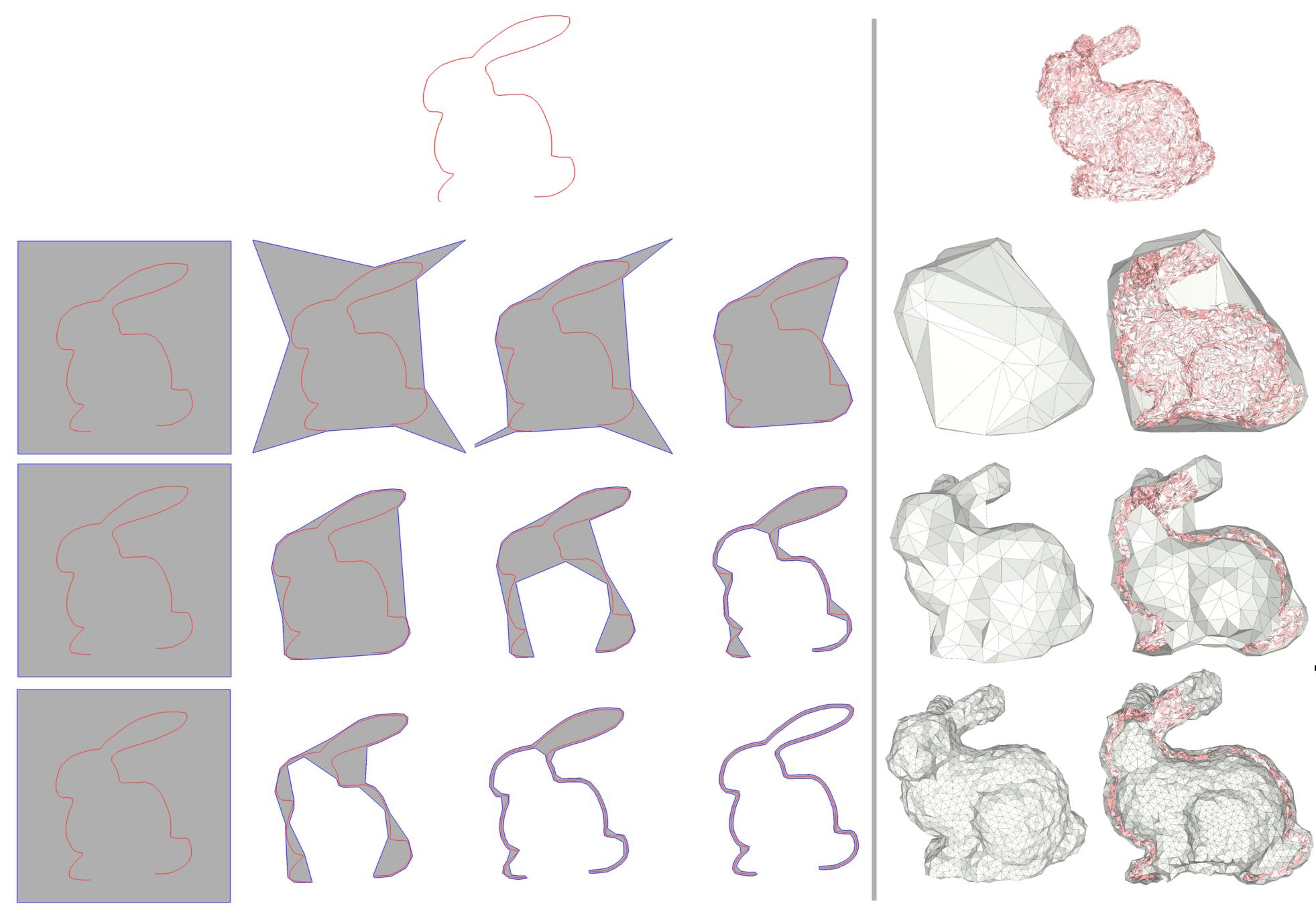 Inspired by alpha shapes, we replace the above notion of carving by shrink-wrapping: we iteratively construct a subcomplex of a 3D Delaunay triangulation by starting from a simple 3D Delaunay triangulation enclosing the input, and then iteratively removing eligible tetrahedra that lie on the boundary of the complex. In addition, the underlying triangulation—and thus the complex incidentally—is refined as shrinking proceeds. Thus, instead of carving from the convex hull of the input data as in alpha shapes, we construct an entirely new mesh through a Delaunay refinement-like algorithm. The refinement algorithm inserts Steiner points on the boundary of an offset volume, defined as a level set of the unsigned distance field to the input.