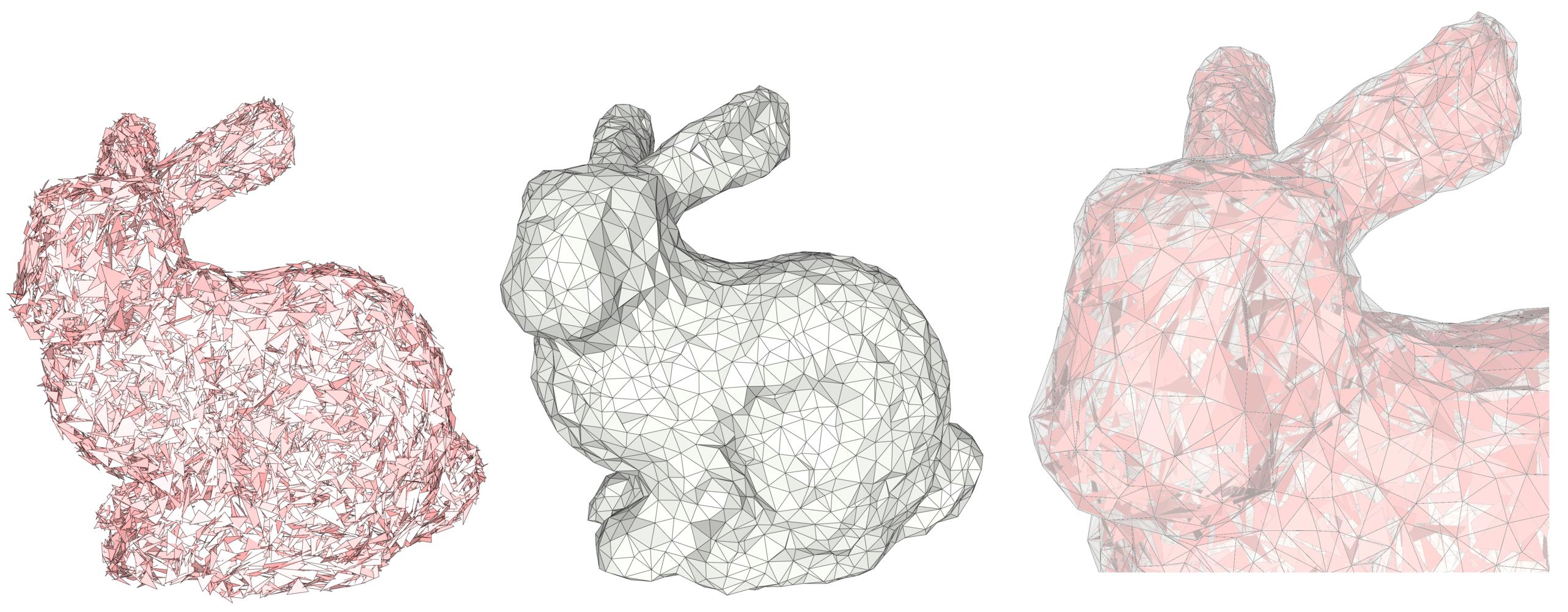 Figure 67.1 Shrink-wrapping output from a triangle soup, with many intersections and gaps. From left to right, input model, output wrap, and superposition.
