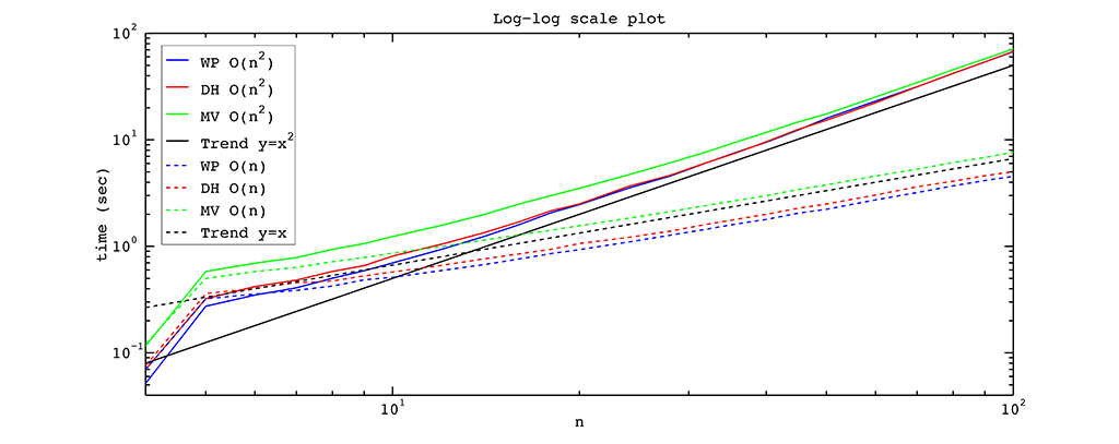 From the figure above we observe that the \(O(n^2)\) algorithm is as fast as the \(O(n)\) algorithm if we have a polygon with a small number of vertices. But as the number of vertices is increased, the linear algorithm outperforms the squared one, as expected. One of the reasons for this behavior is that for a small number of vertices the multiplications of \(n-2\) elements inside the \(O(n^2)\) algorithm take almost the same time as the corresponding divisions in the \(O(n)\) algorithm. For a polygon with many vertices, these multiplications are substantially slower.