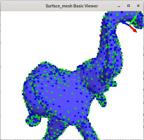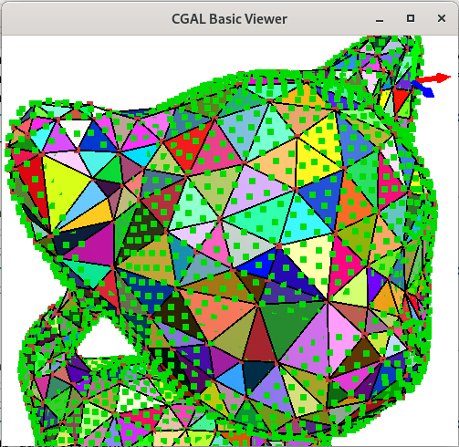 The following example shows how to use graphics scene options to tune the drawing of a surface mesh. We define our own class My_graphics_scene_options that inherits from Graphics_scene_options to get all the default parameters. In this class, we only override the two methods colored_vertex and vertex_color to draw all vertices in color, and chose randomly green or blue colors for one out of two vertices.