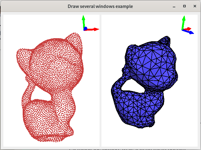 In the following example, we create two graphics scenes, one filled with a point cloud, a second one filled with the polyhedral surface reconstructed by the Poisson surface reconstruction method. Then, we create two basic viewers associated with these two scenes. The two basic viewers are added into a Qt layout allowing to visualize the two scenes side by side.