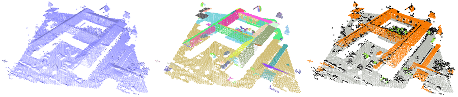 Figure 91.4 Example of cluster classification mesh (left: input, middle: clusters computed from region growing, right: output). Ground is grey, roofs are orange, vegetation is green, points not assigned to a cluster are black.