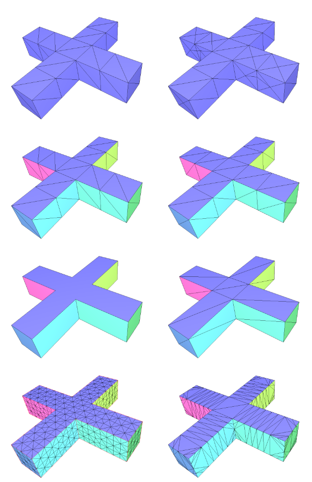 From top to bottom, the lines show different input PLC, from the same input triangulated surface and, for each of them, the resulting conforming constrained Delaunay triangulation. The input data are: