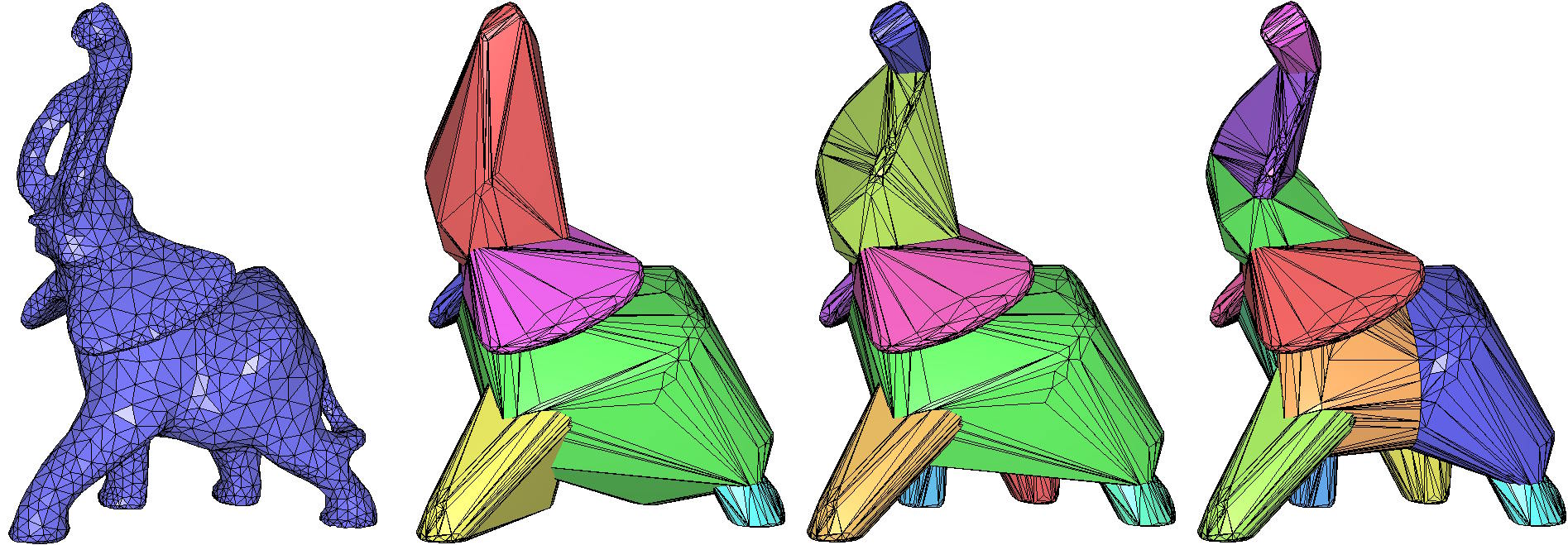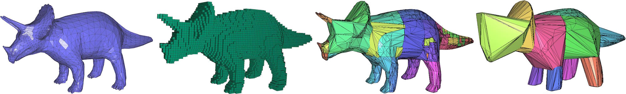 From left to right: 1. input mesh 2. voxel grid 3. convex volumes after error-driven splitting 4. final convex volumes after merging