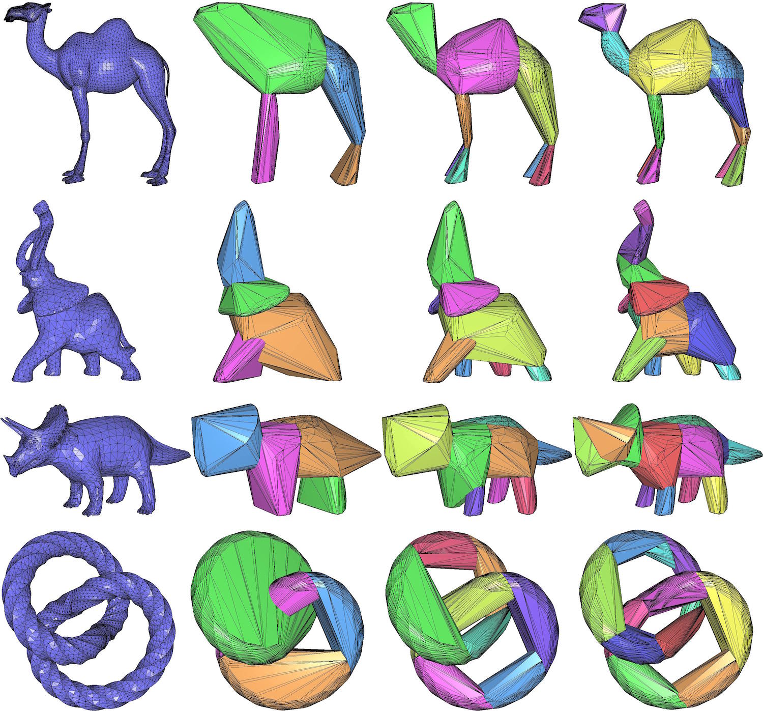 From left to right: input mesh, 6, 9, and 12 convex volumes