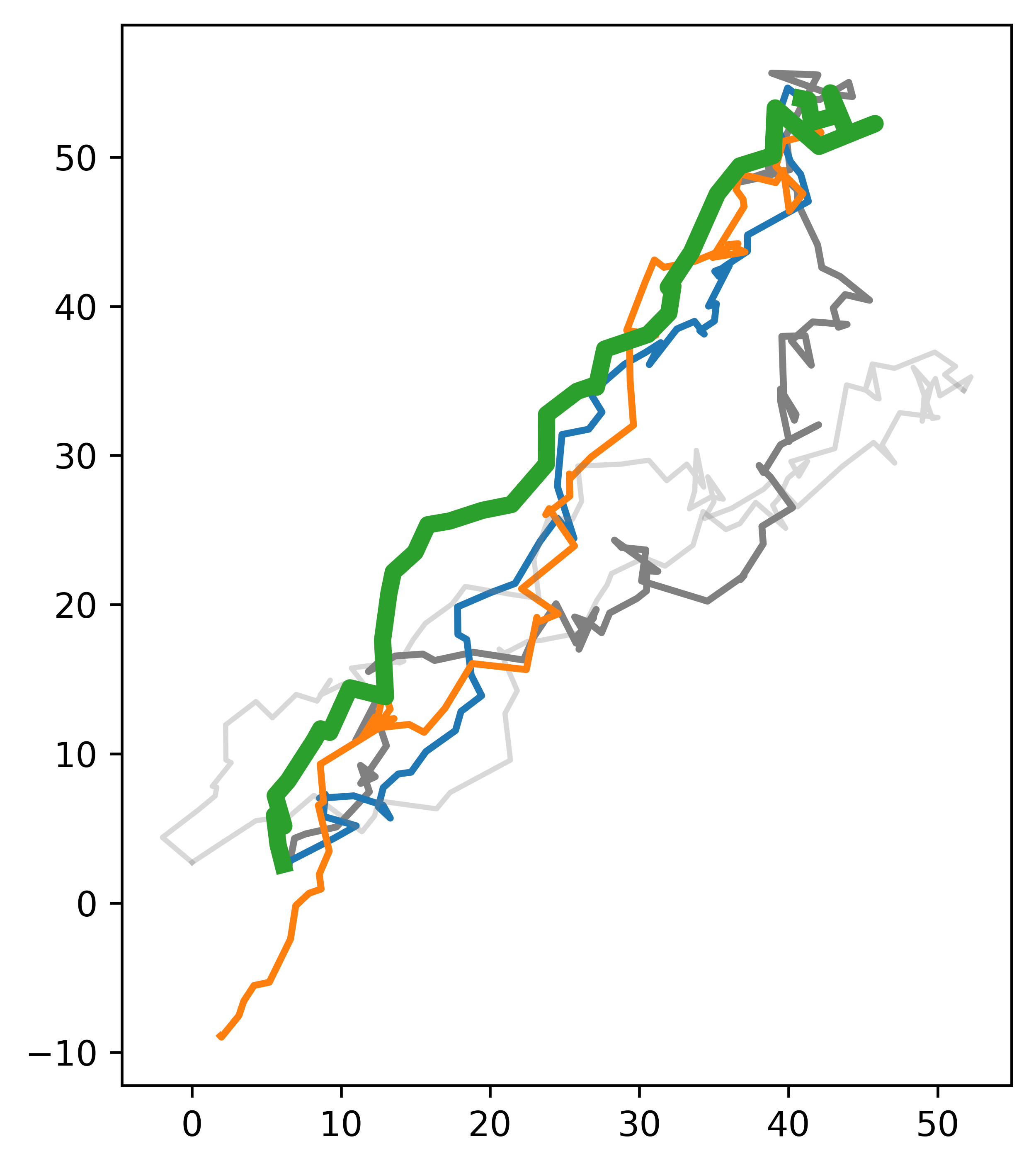 The following example shows how we can compute the Fréchet distance up to a given error bound on two polylines in 4-dimensional Euclidean space using bounded_error_Frechet_distance()