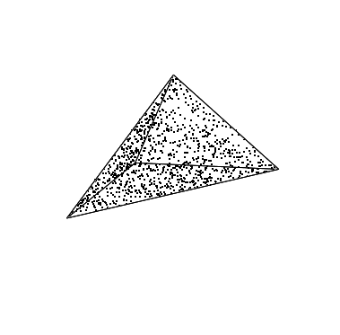 During Google Summer of Code 2013, Pedro M. M. de Castro and Alexandru Tifrea coded generators for points in triangle (2D and 3D) and in tetrahedra (3D). Basically, in order to generate a random point in a \(N\)-simplex (a triangle for \(N = 2\), and tetrahedron for \(N = 3\)), we generate numbers \(a_1,a_2,\ldots,a_N\) identically and independently uniformly distributed in \((0,1)\), we sort them, we let \(a_0 = 0\) and \(a_{N+1} = 1\), and then \(a_{i+1}-a_i\), for \(i = 1,\ldots,N\) becomes its barycentric coordinates with respect to the simplex.