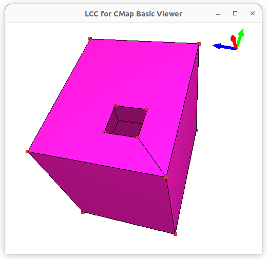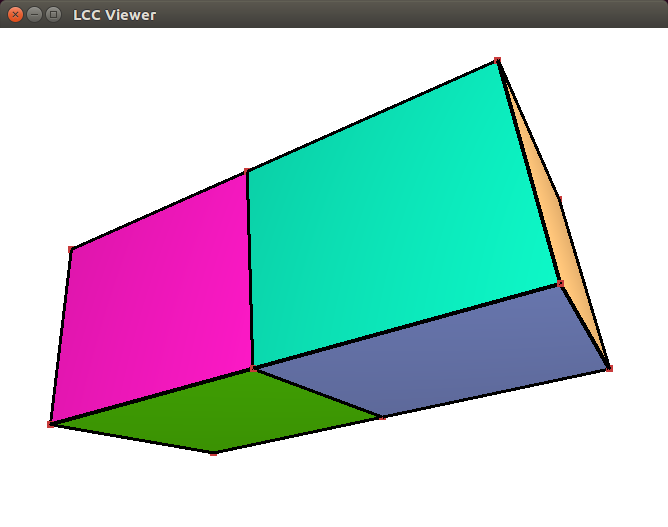A linear cell complex can be visualized by calling the CGAL::draw<LCC>() function as shown in the following example. This function opens a new window showing the given linear cell complex. A call to this function is blocking, that is the program continues as soon as the user closes the window.