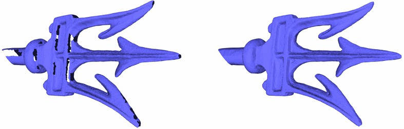 The hole filling algorithm has a complexity which depends on the number of vertices. While [2] has a running time of \(O(n^3)\) , [3] in most cases has running time of \(O(n \log n)\). We benchmarked the function triangulate_refine_and_fair_hole() for the two meshes below (as well as two more meshes with smaller holes). The machine used was a PC running Windows 10 with an Intel Core i7 CPU clocked at 2.70 GHz. The program was compiled with the Visual C++ 2013 compiler with the O2 option, which maximizes speed.