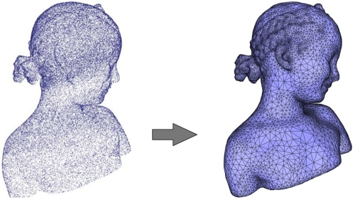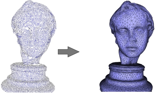 Figure 68.3 Poisson reconstruction. Left: 120K points sampled on a statue (Minolta laser scanner). Right: reconstructed surface mesh.