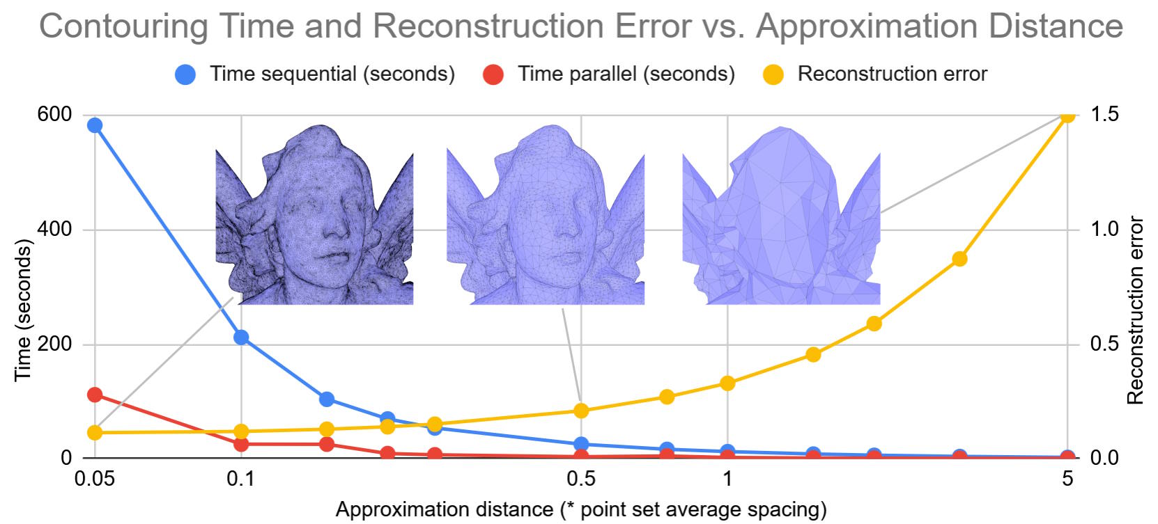 Figure 68.14 Contouring duration (in s) and reconstruction error (mm) against several approximation distance parameters for the Lucy point set simplified to 100k points.