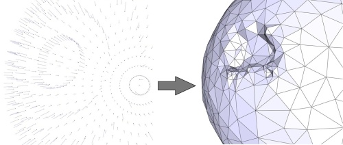 Figure 68.11 Left: points sampled on a sphere with a cluster of wrongly oriented normals. Right: reconstructed surface mesh with a spurious bump.