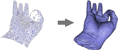 Figure 68.9 Left: 65K points sampled on a hand with no data captured at the wrist base. Right: reconstructed surface mesh. The surface is properly closed on the fingers and also closed at the wrist but in a less plausible manner.