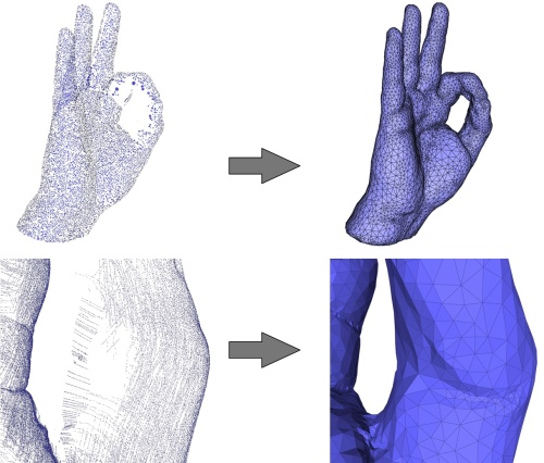 Figure 68.5 Top left: 65K points sampled on a hand (Kreon laser scanner). Bottom left: the point set is highly anisotropic due to the scanning technology. Right: reconstructed surface mesh and closeup. The holes are properly closed.