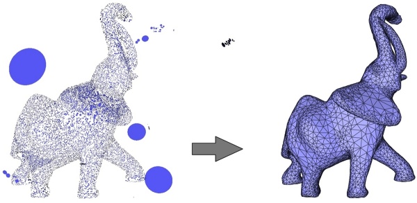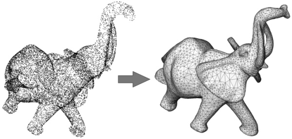Left: 17K points sampled on the statue of an elephant with a Minolta laser scanner. Right: reconstructed surface mesh.