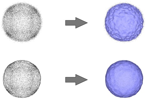 A large amount of noise inevitably impacts on the reconstruction (see Figure 68.12, top) and the current implementation does not provide any mean to trade data fitting for smoothness. Nevertheless if the signal-to-noise ratio is sufficiently high and/or the surface approximation and sizing parameters set for contouring the iso-surface is large with respect to the noise level the output surface mesh will appear smooth (not shown). If the user wants to produce a smooth and detailed output surface mesh, we recommend to apply smoothing through jet_smooth_point_set()