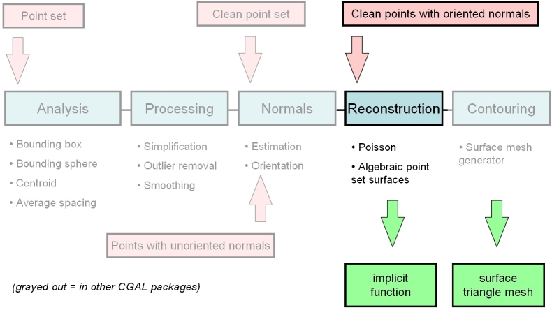 This CGAL component implements a surface reconstruction method which takes as input point sets with oriented normals and computes an implicit function. We assume that the input points contain no outliers and little noise. The output surface mesh is generated by extracting an isosurface of this function with the 3D Mesh Generation or potentially with any other surface contouring algorithm.