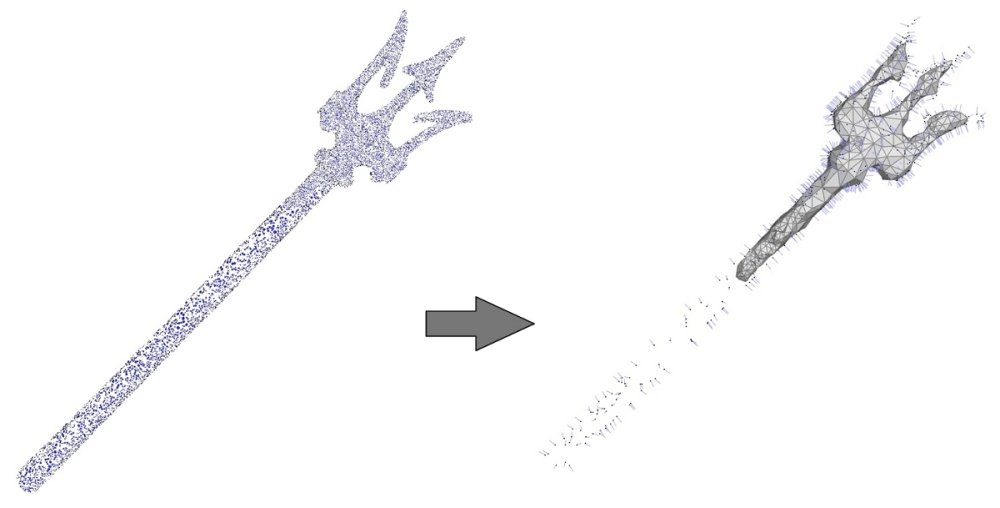 Figure 68.8 Left: 50K points sampled on the Neptune trident. The reconstruction (not shown) is successful in this case. Right: point set simplified to 1K points then reconstructed (all input points are depicted with normals). The thin feature is not reconstructed.