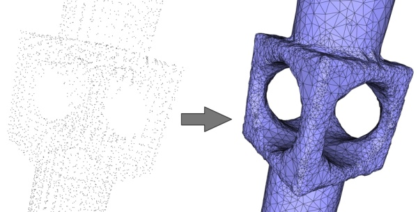 Figure 68.13 Left: 5K points sampled on a mechanical piece with sharp features (creases, darts and corners). Right: reconstructed surface mesh with smoothed creases.