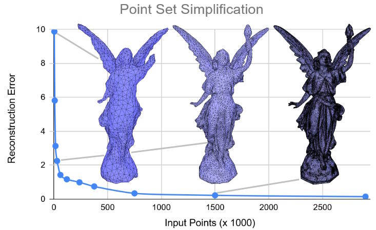 We measure the reconstruction error for the Lucy point set (2.9M points) as well as for simplified versions. All reconstructions use the recommended contouring parameter approximation distance = 0.25 * the input point