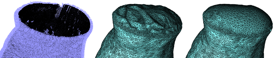 Ideally the current implementation of the Poisson surface reconstruction method expects a dense 3D oriented point set (typically matching the epsilon-sampling condition [1]) and sampled over a closed, smooth surface. Oriented herein means that all 3D points must come with consistently oriented normals to the inferred surface. Figure 68.3 and Figure 68.4 illustrate cases where these ideal conditions are met.