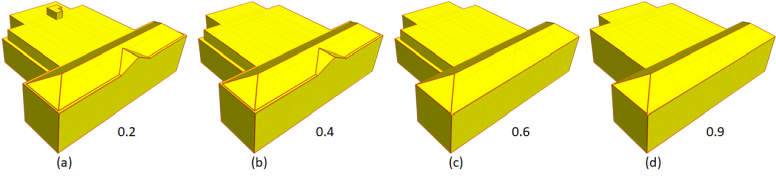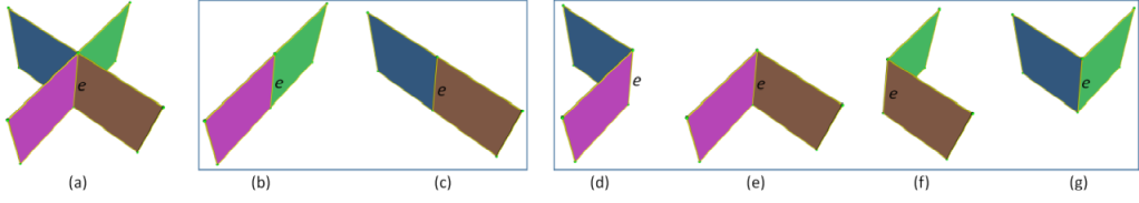 \(|E|\) denotes the total number of pairwise intersections in the candidate face set. \(corner(e_i)\) is an indicator function whose value is determined by the configuration of the two selected faces connected by \(e_i\). \(corner(e_i)\) will have a value of 1 if the faces associated with \(e_i\) introduce a sharp edge in the final model. Otherwise, \(corner(e_i)\) has a zero value meaning the two faces are coplanar.
