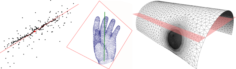 Figure 105.1 Left: fitting a line to a 2D point set (centroid dotted in red). Middle: fitting a line and a plane to a 3D point set. Right: fitting a plane to a set of 3D triangles.