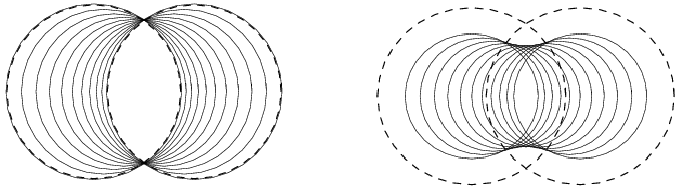 Figure 61.1 Left: Convex combinations of two weighted points (the two dashed circles). Right: The skin curve of the weighted points. The smaller circles form a subset of the weighted points whose boundary is the skin curve.