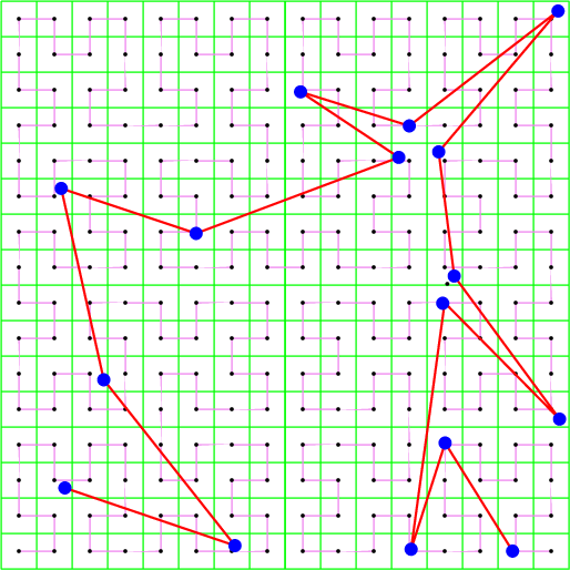 If instead of subdividing the square in a fixed way at its center, as above, we subdivide it by splitting at the median point (in \( x\) or \( y\) directions alternating), we construct a 2-d tree adapted to the point set. This tree can be visited in a similar manner and we get also a suitable ordering of the points; we call this subdivision policy: median policy (see Figure 101.3).