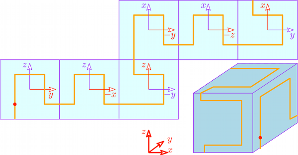 Actually, we approximate a space filling curve on the unit sphere by a space filling curve on a cube (with facets at \(x, y, z = \pm 1/\sqrt{3}\)). Roughly speaking, we split the original set of points in six subsets corresponding to the six facets of the cube. The subset corresponding to a facet \(f\) is the set of points that lie in the half-space defined by the supporting plane of \(f\) that does not contain the origin. And then we basically use the 2D Hilbert sort with its corresponding policy, as explained above for the projection of the points in each subset on its corresponding facet of the cube. The axes orientation on each facet is chosen so that the space filling curve covers the whole cube without any jump; see Figure 101.4. A point can lie in more than one such half-plane, so, we give a priority for each facet of the cube. The priority order is: first, the facet of the cube at \(x = 1/\sqrt{3}\); second, the facet of the cube at \(y = 1/\sqrt{3}\); third, the facet of the cube at \( x = -1/\sqrt{3}\); fourth, the facet of the cube at \( z = 1/\sqrt{3}\); fifth, the facet of the cube at \( y = -1/\sqrt{3}\); and, sixth, the facet of the cube at \( z = -1/\sqrt{3}\).