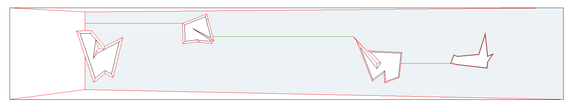 Figure 21.7 A polygon with four holes (black) and its straight skeleton (red). Three artificial bisectors (green) are added in a postprocessing step to recover the simply-connected property for the straight skeleton face (gray) of the rightmost vertical contour edge.