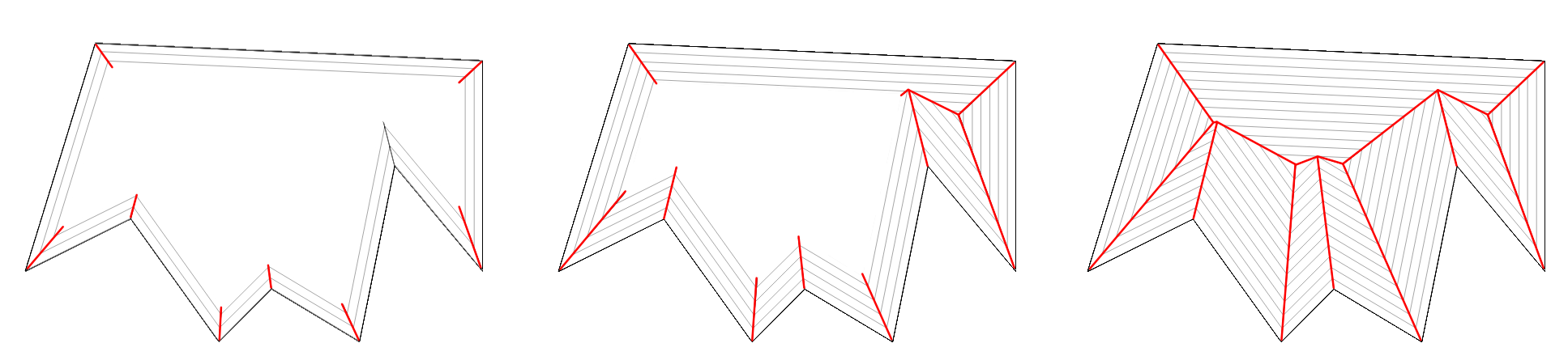The straight skeleton is spawned by applying a continuous, inward offsetting to the contour edges. Under this transformation, polygon vertices move along the angular bisector of the lines subtending the edges, at a speed that depends on the angle between the two incident contour edges. So-called events happen when two moving vertices impact each other, or when a moving vertex collides with an offset edge. The different event types are detailed in the documentation of the class CGAL::Straight_skeleton_builder_2