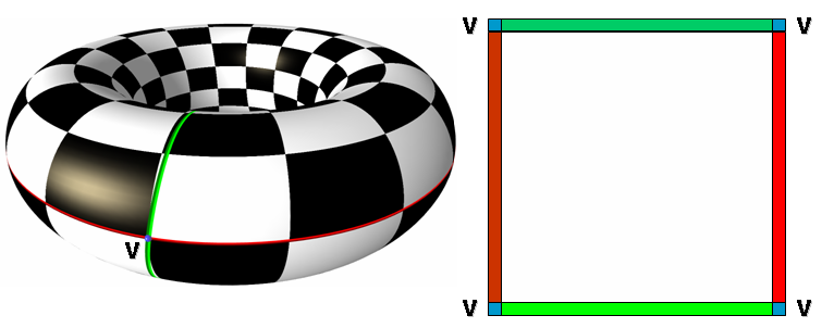 is used to cut it into a topological disk. In Figure 80.3, the seam is traced in red and the four cones used for Orbifold Tutte Parameterization (Section Orbifold Tutte Embeddings) are marked with green dots.
