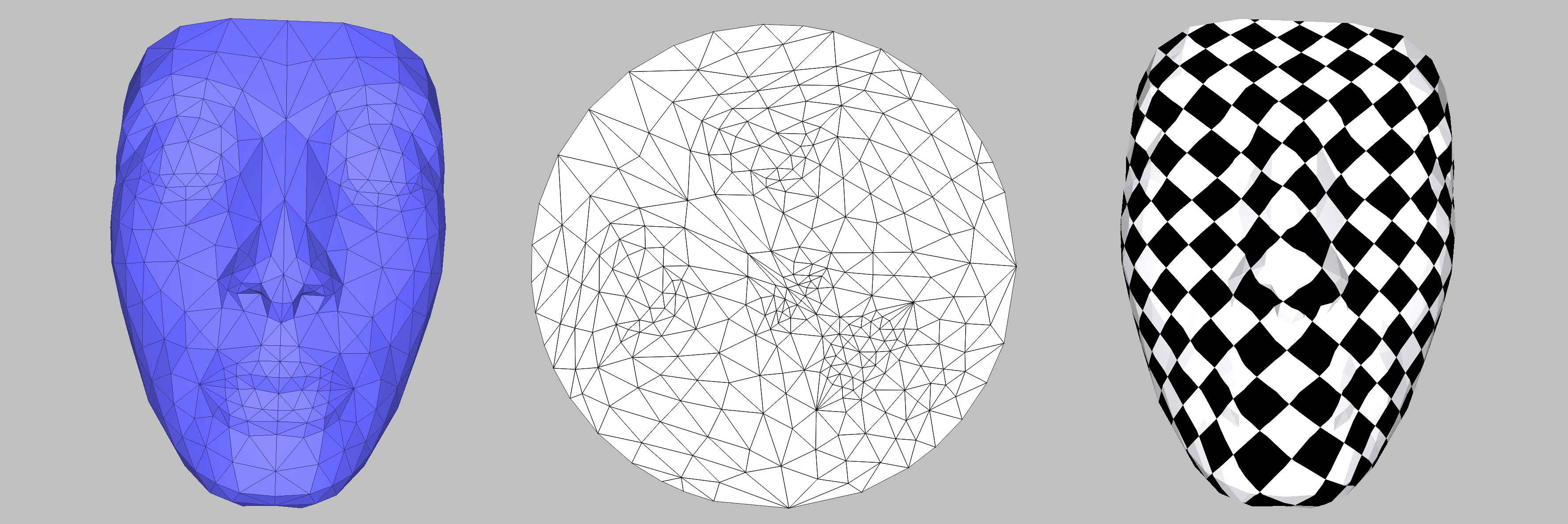 It computes a one-to-one mapping from a 3D triangle surface mesh to a simple 2D domain. The mapping is piecewise linear on the triangle mesh. The result is a pair (u,v) of parameter coordinates for each vertex of the input mesh. A one-to-one mapping may be guaranteed or not, depending on the choice of the Parameterizer_3 algorithm.
