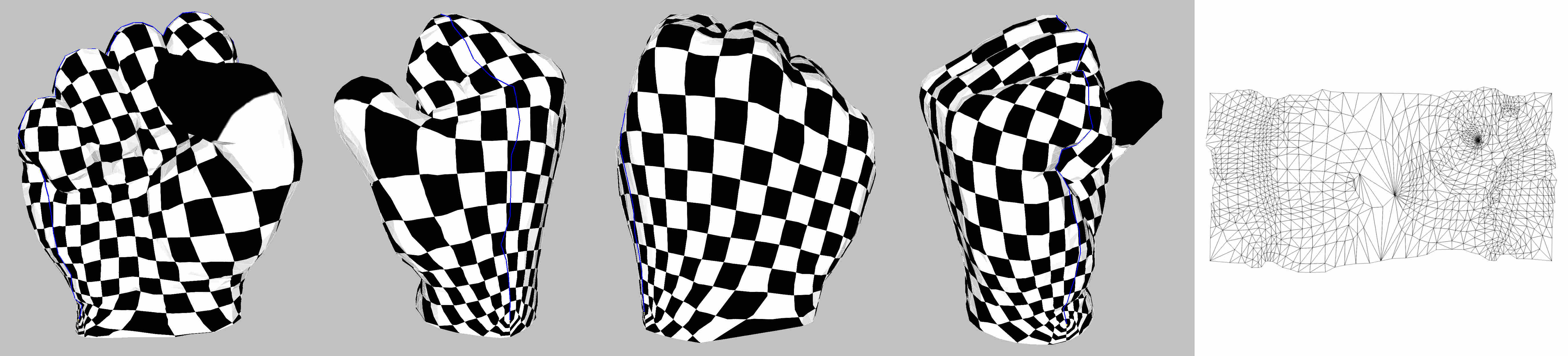 Figure 80.11 As Rigid As Possible parameterization (the blue line depicts the cut graph). Rightmost: parameter space.