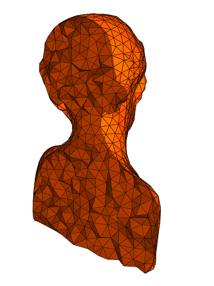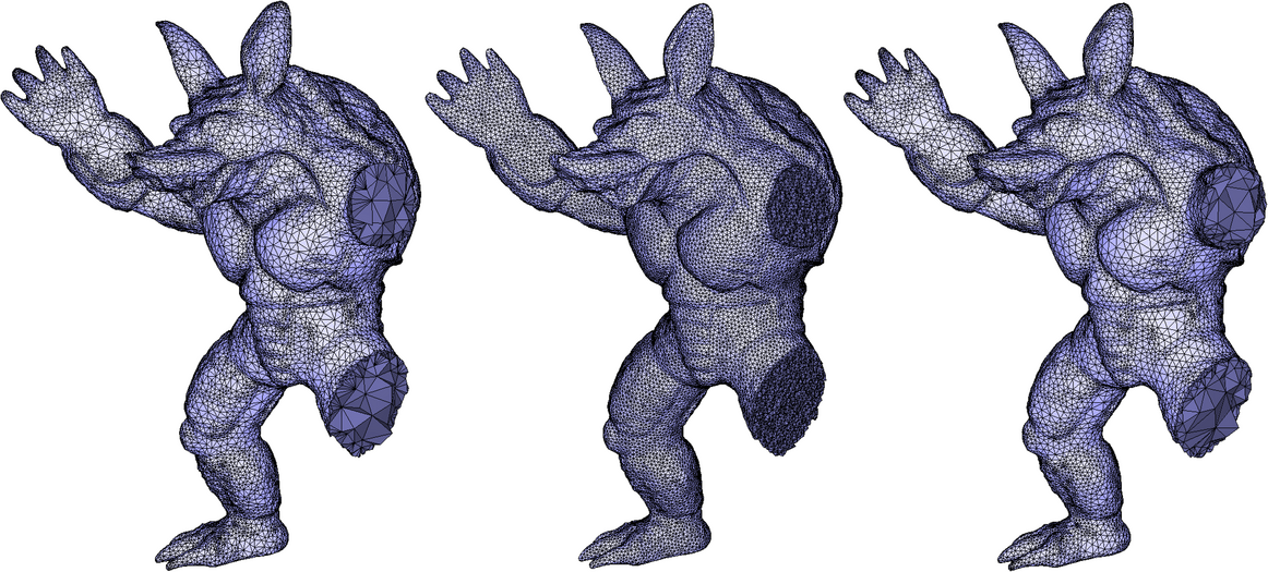 It is also possible to use a custom sizing function, like for example the same sizing field as the one used for initial tetrahedral mesh generation using the CGAL 3D Mesh Generation package, and consecutive consistent isotropic remeshing, as shown by Figure 65.3. Note that the remeshed version is denser than the one generated by CGAL::make_mesh_3()