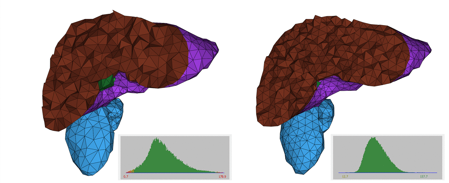 The tetrahedral remeshing algorithm improves the quality of dihedral angles, while targeting the user-defined uniform sizing field and preserving the topology of the feature complex, as highlighted by Figure 65.1.