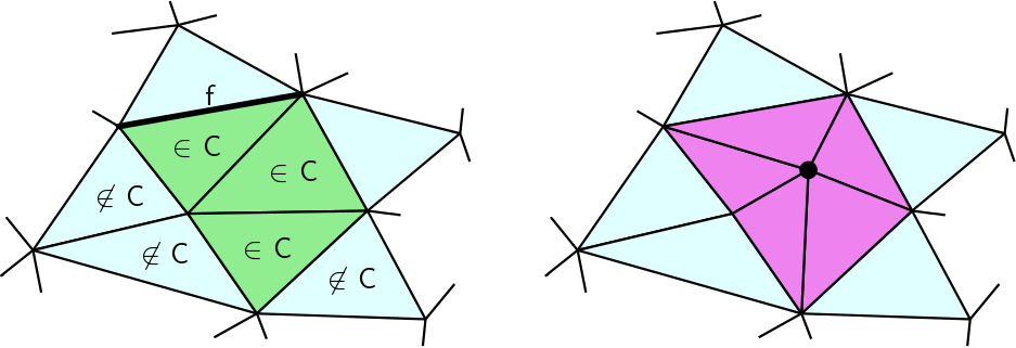 . \( H\), the union of full cells in \( C\), is simply connected and its boundary \( \partial H\) is a combinatorial triangulation of the sphere \( \mathbb{S}^{d-1}\). All vertices of cells of \( C\) are on \( \partial H\).Figure 52.4 Insertion in a hole, \( d=2\)