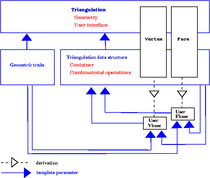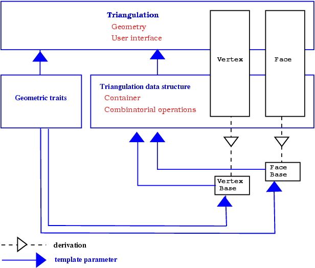 has two template parameters standing for a vertex class and a face class. CGAL defines concepts for these template parameters and provide default models for these concepts. The vertex and base classes are templated by the geometric traits class which enables them to obtain some knowledge of the geometric primitives of the triangulation. Those default vertex and face base classes can be replaced by user customized base classes in order, for example, to deal with additional properties attached to the vertices or faces of a triangulation. See Section Flexibility for more details on the way to make use of this flexibility.